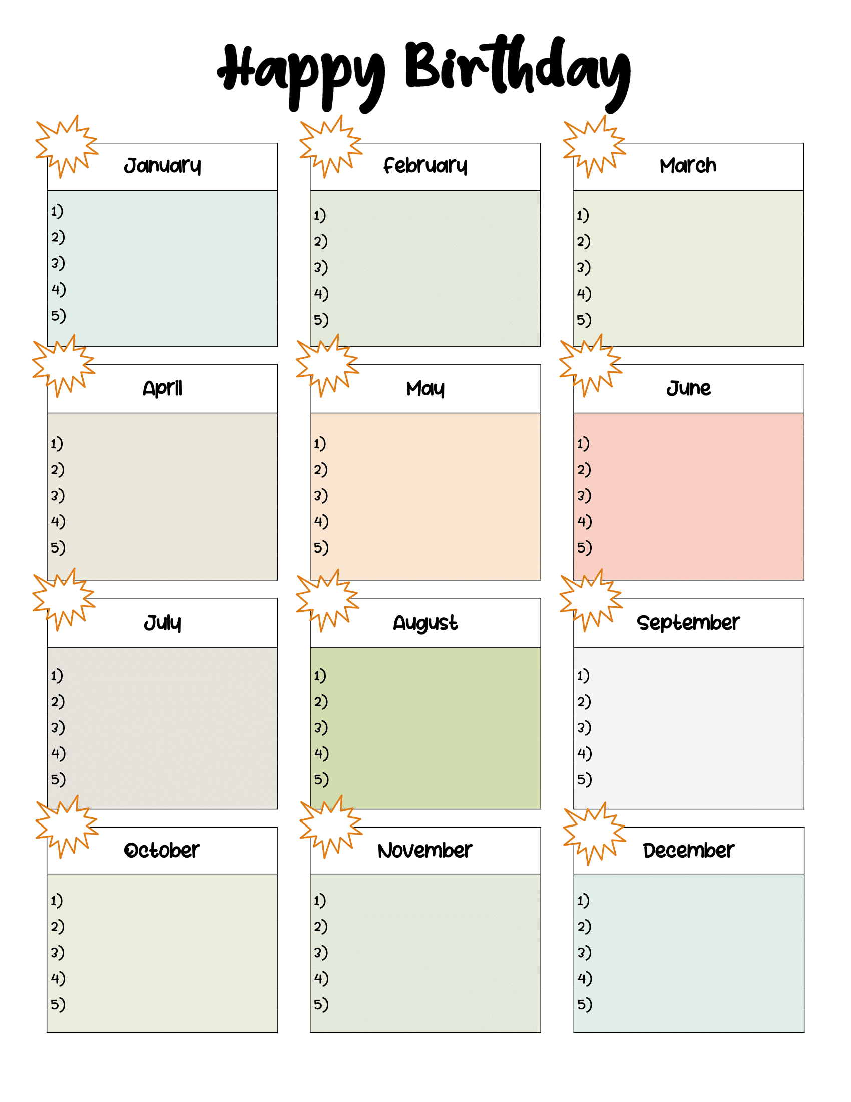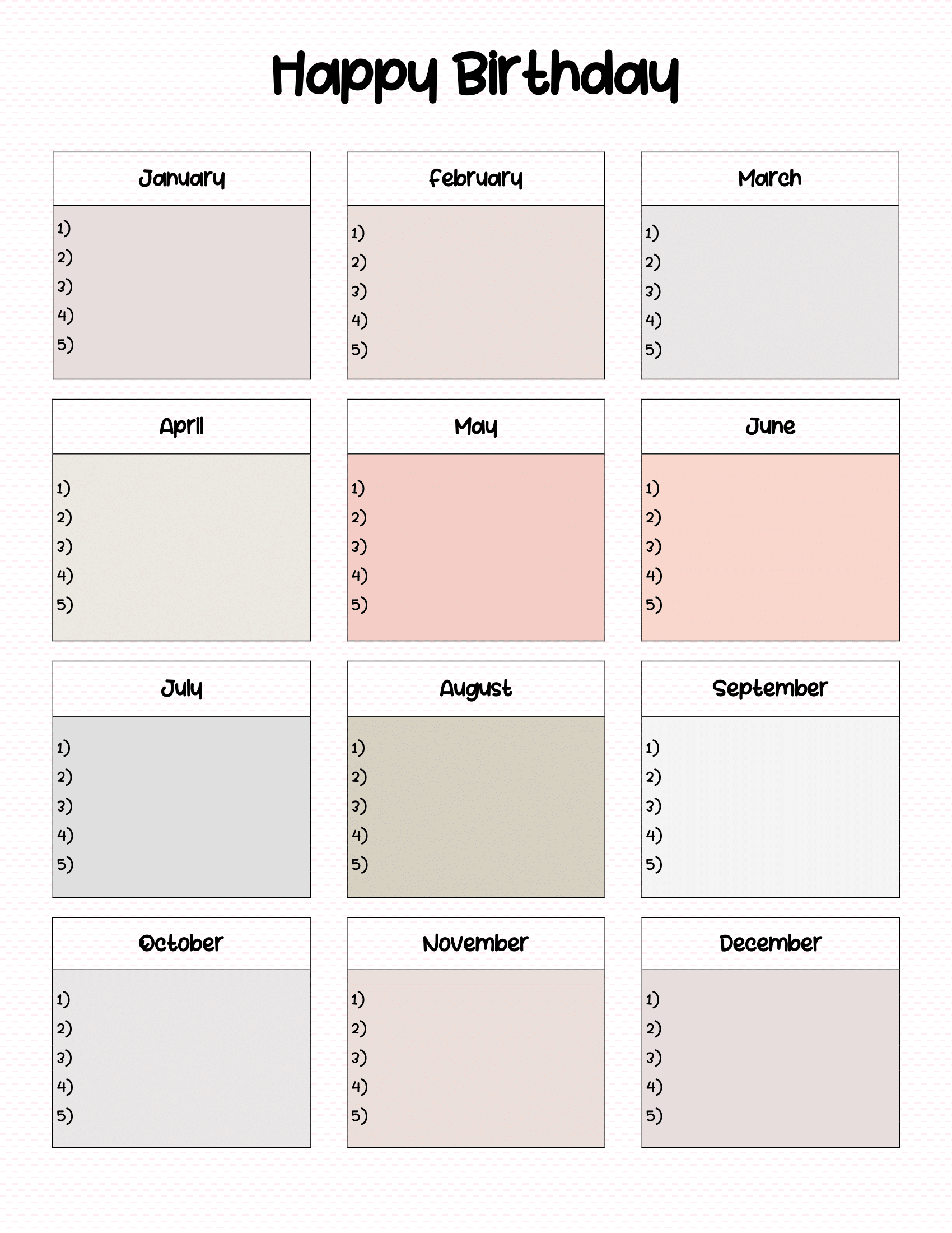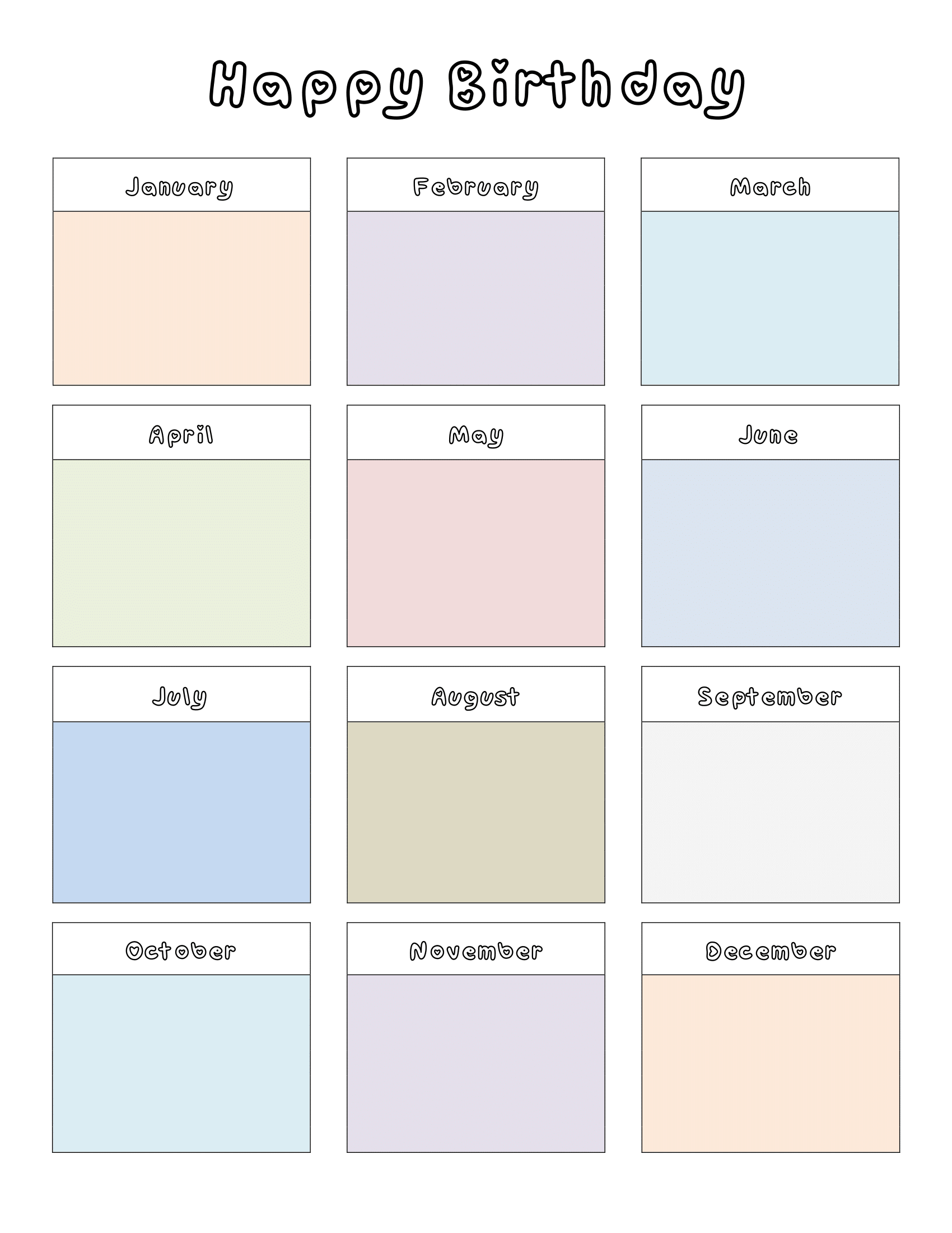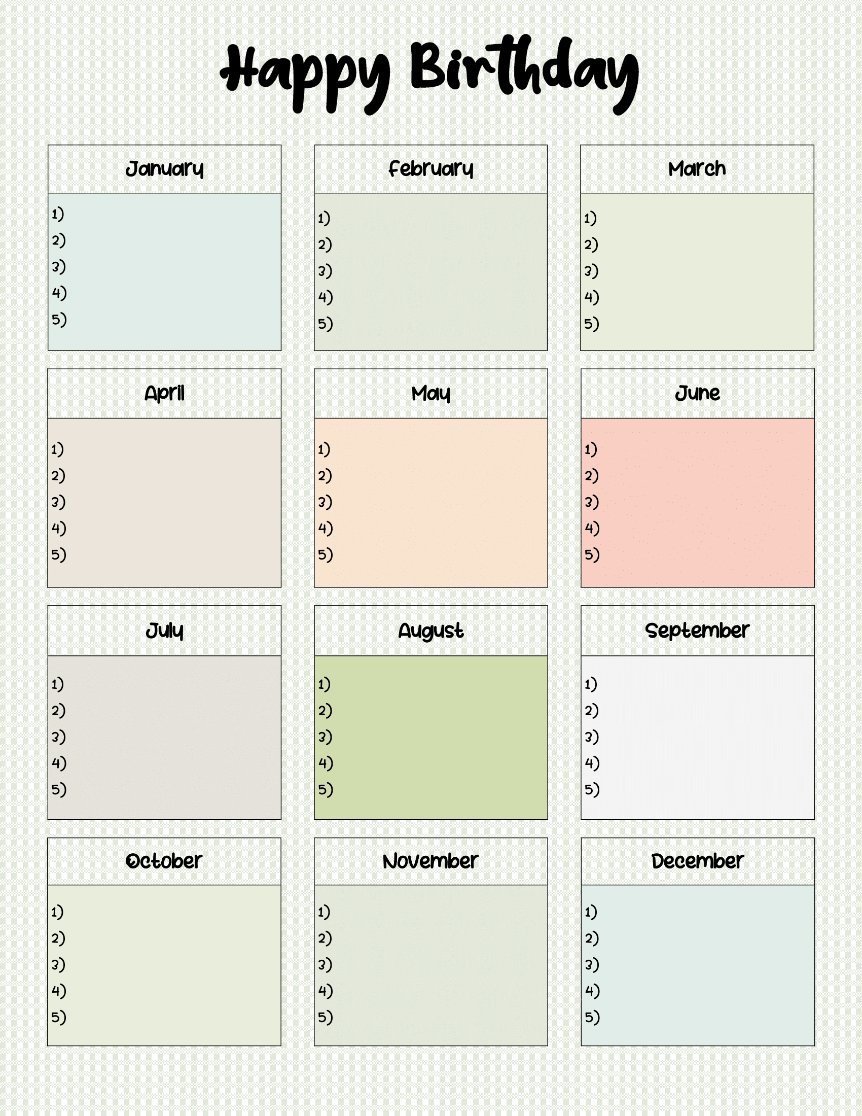 If you find it difficult to remember birthdays, whether they are of family members or friends, I have brought some useful templates for you. You can stick these templates on your desk in your room or on any wall. In these templates, all 12 months are displayed on a single page, with a separate blank block for each month to note down birthday dates. All these templates are completely free and can be downloaded in PDF format. You can print them using A4, A5, or Letter-size paper.