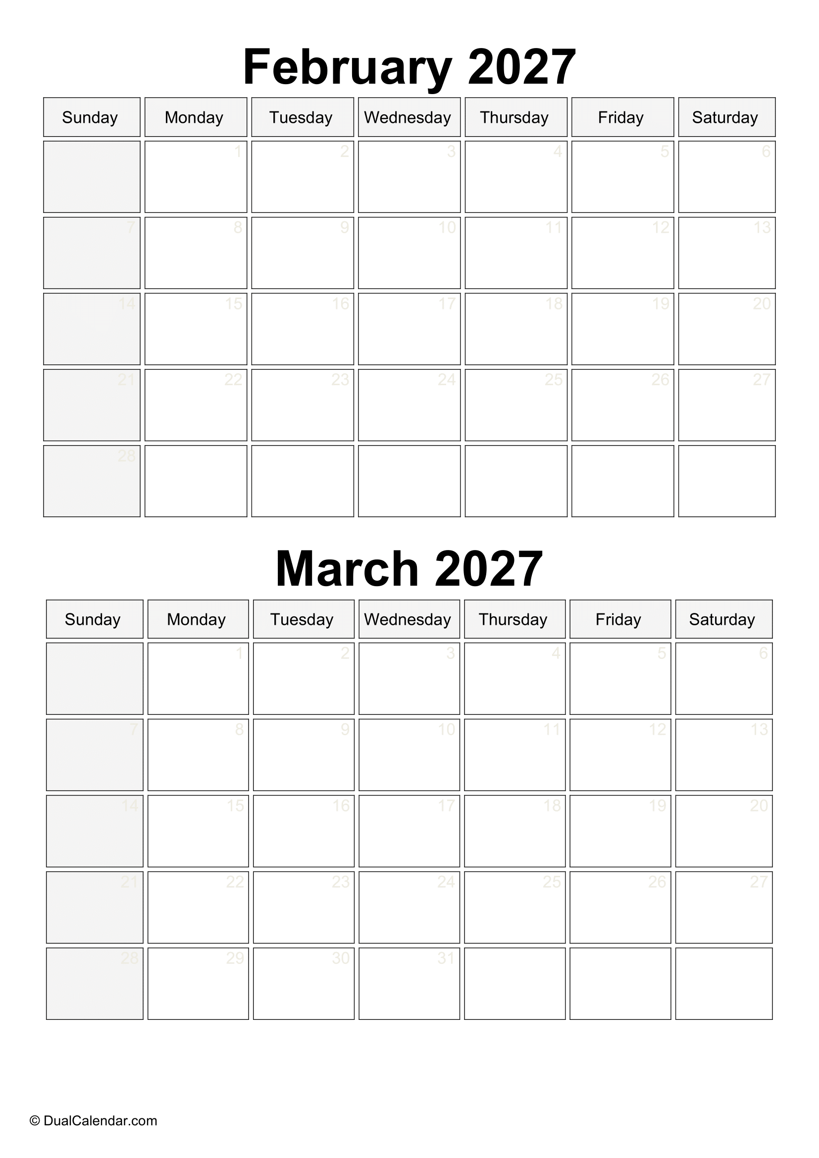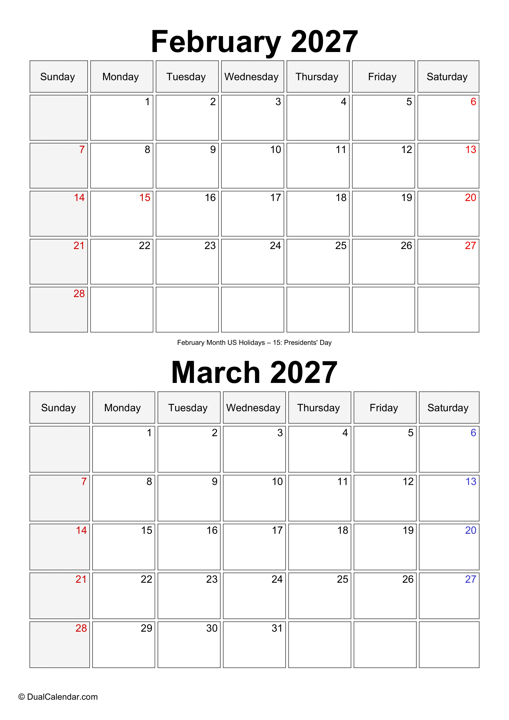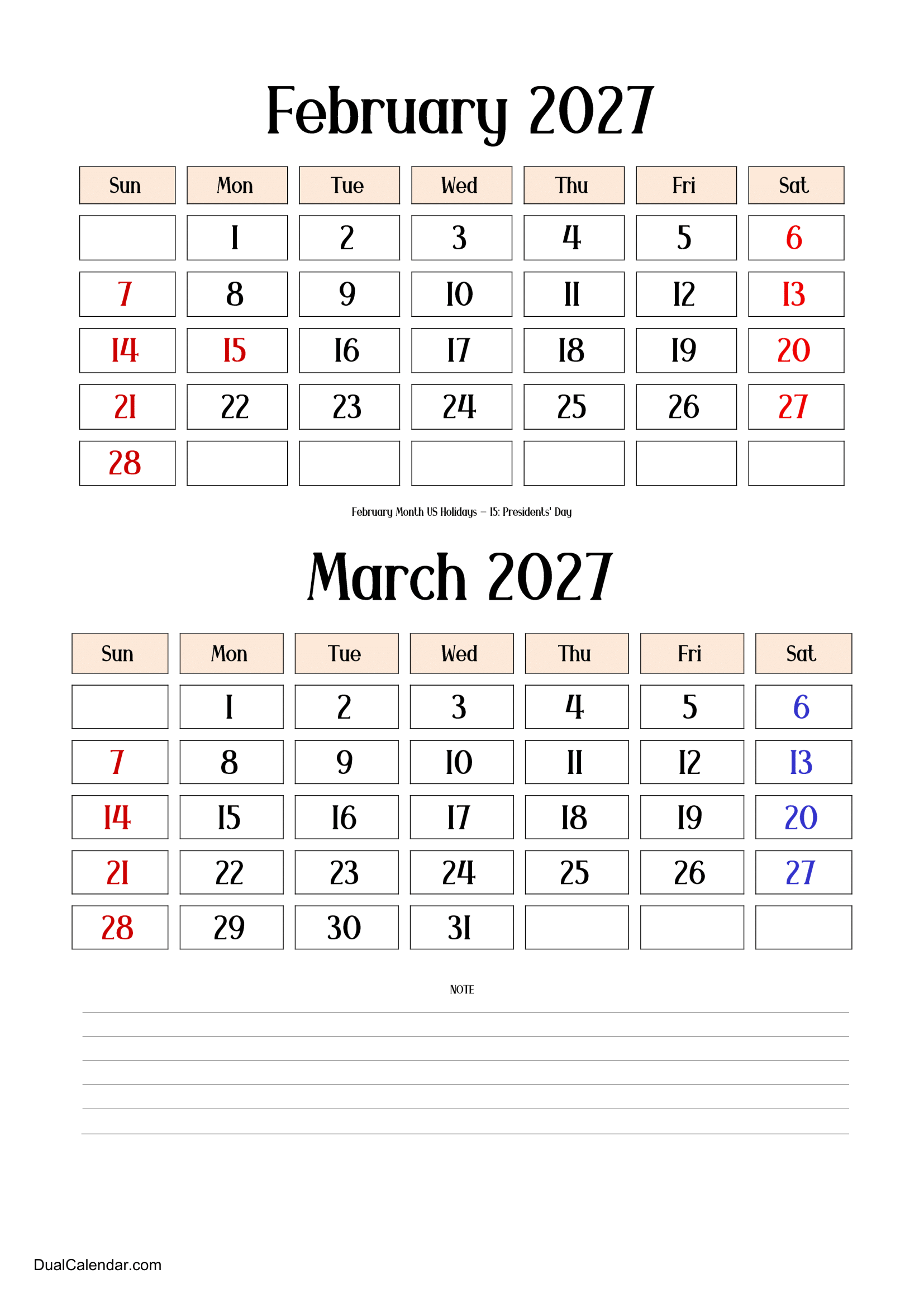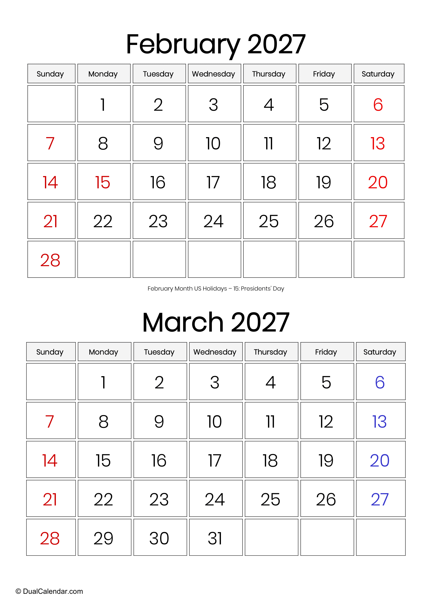 February and March 2027 calendar is a practical planning tool designed to organize the late winter and early spring months efficiently. Displaying both months together helps track important dates, deadlines, and upcoming events at a glance and also stop the paper waste. With a clean, easy-to-read layout, it supports personal scheduling, office planning, and academic use. These calendar is ideal for managing routines, appointments, goals, and reminders for birthday while keeping plans clear, organized, and accessible throughout the season.