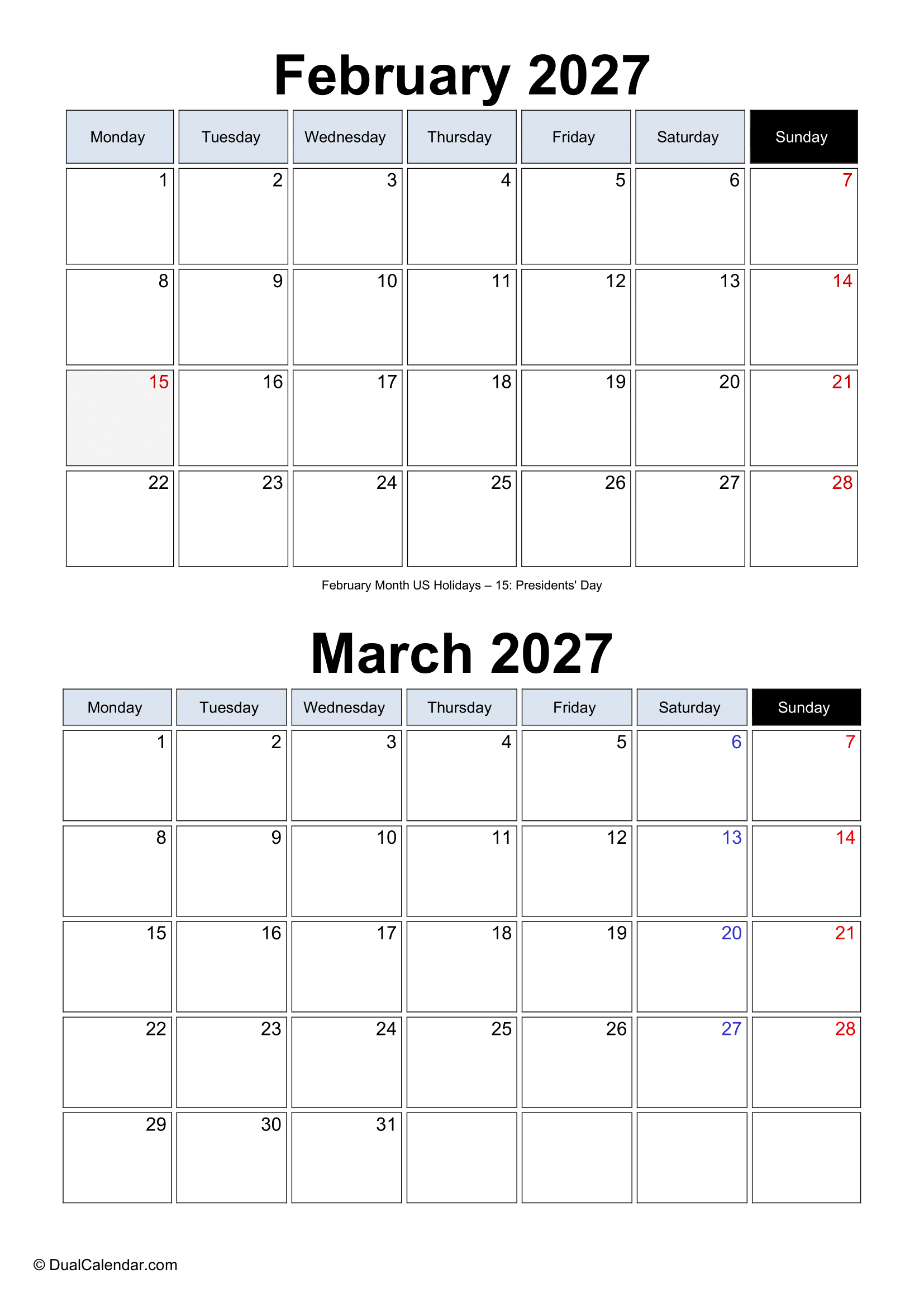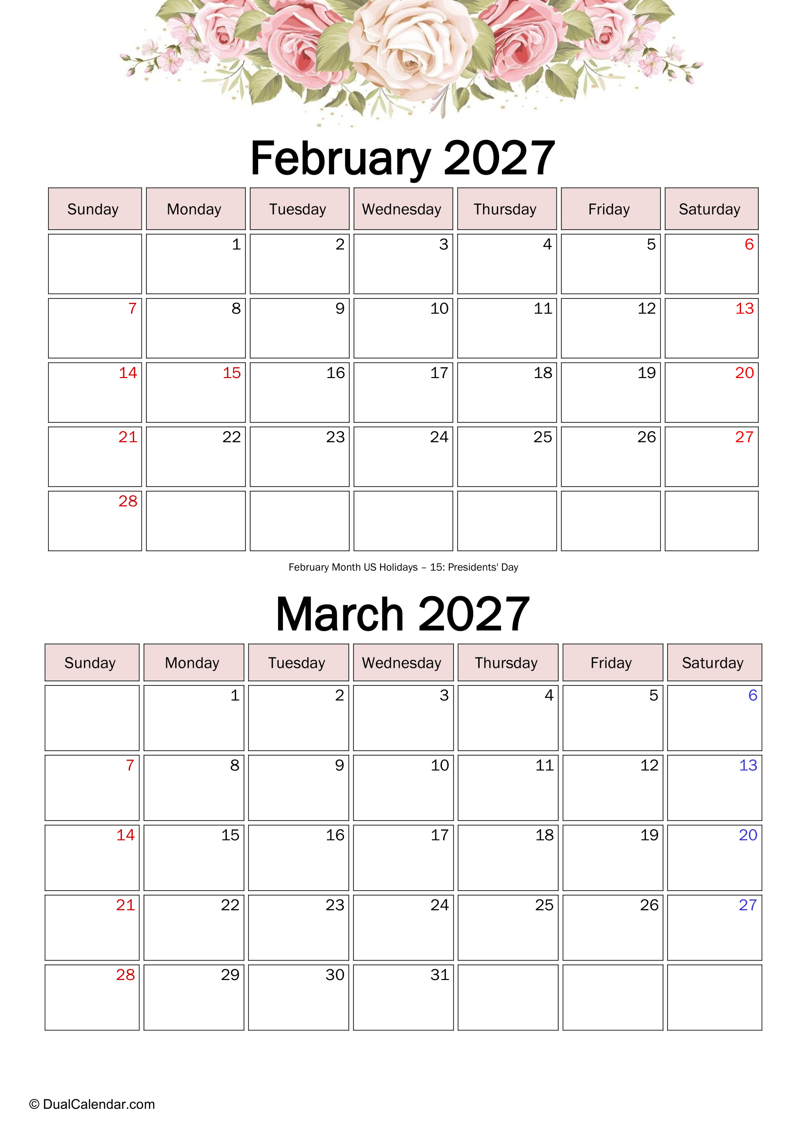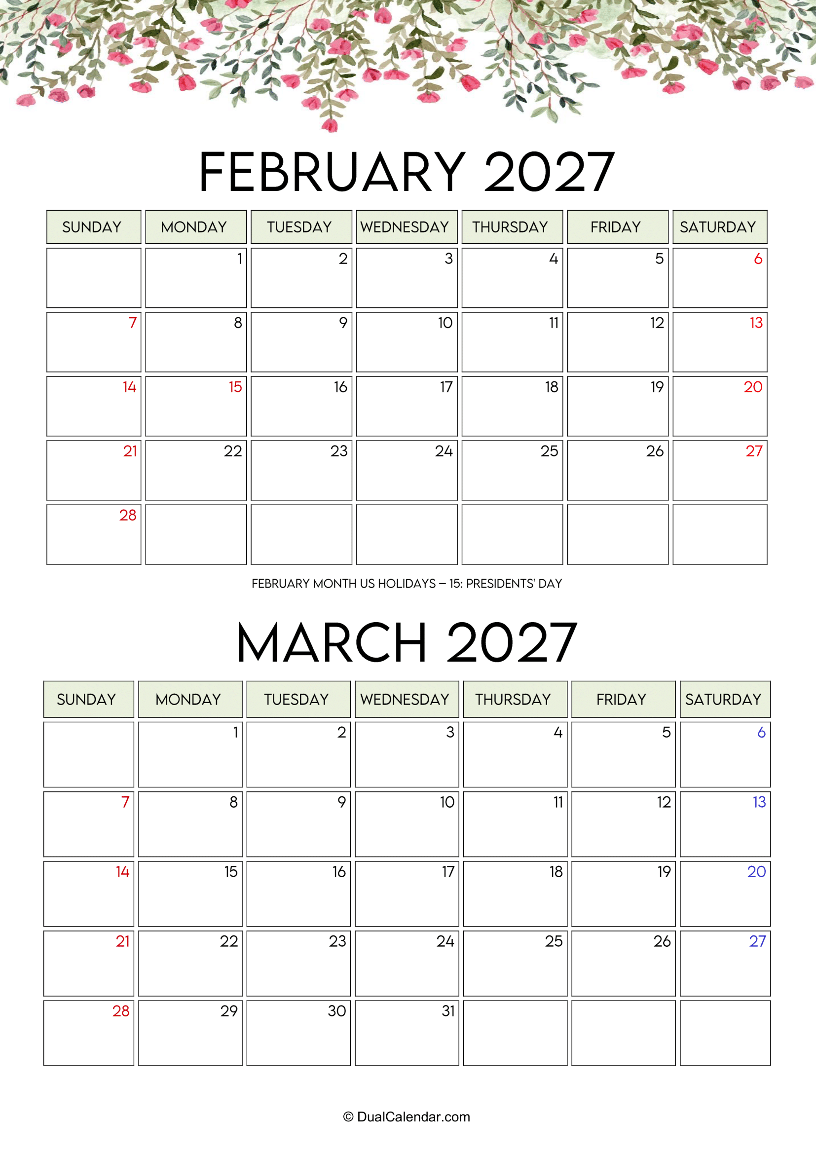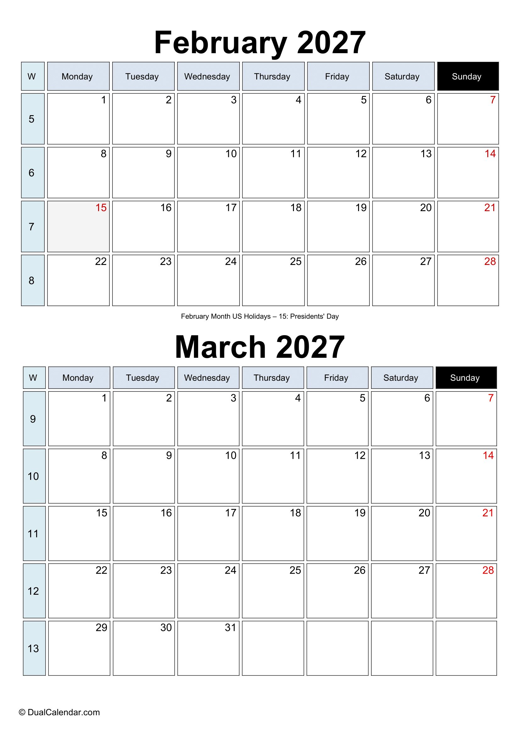 February and March 2027 calendar is a practical planning tool designed to organize the late winter and early spring months efficiently. Displaying both months together helps track important dates, deadlines, and upcoming events at a glance and also stop the paper waste. With a clean, easy-to-read layout, it supports personal scheduling, office planning, and academic use. These calendar is ideal for managing routines, appointments, goals, and reminders for birthday while keeping plans clear, organized, and accessible throughout the season.
