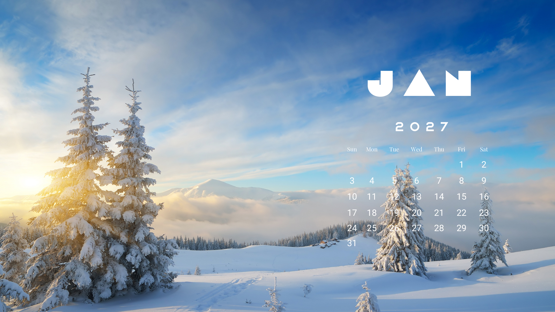 Blue and White Snow Scenery January 2027 Calendar Desktop Background