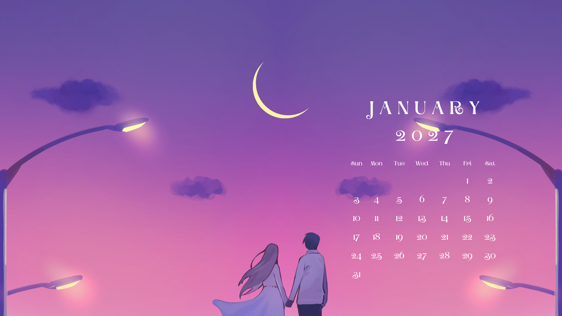 Purple Illustration Night January 2027 Calendar Desktop Wallpaper