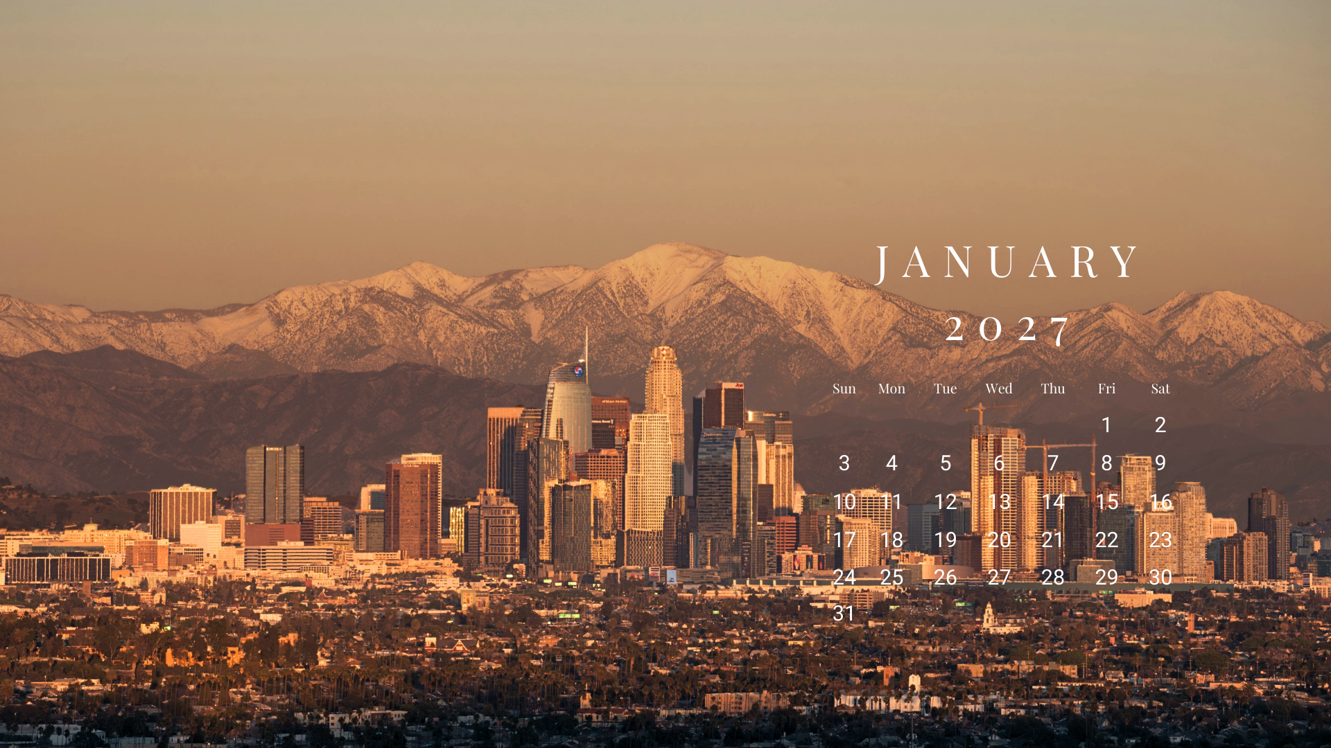 White Typographic Modern Los Angeles City Landscape January 2027 Desktop Wallpaper