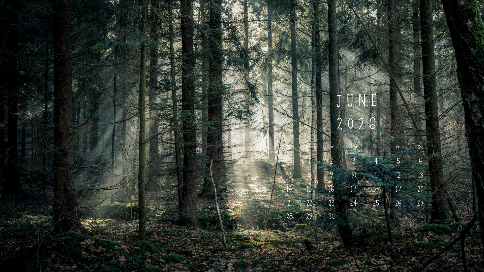 Black and Dark Green Forest Minimalist June 2026 Calendar Desktop Wallpaper