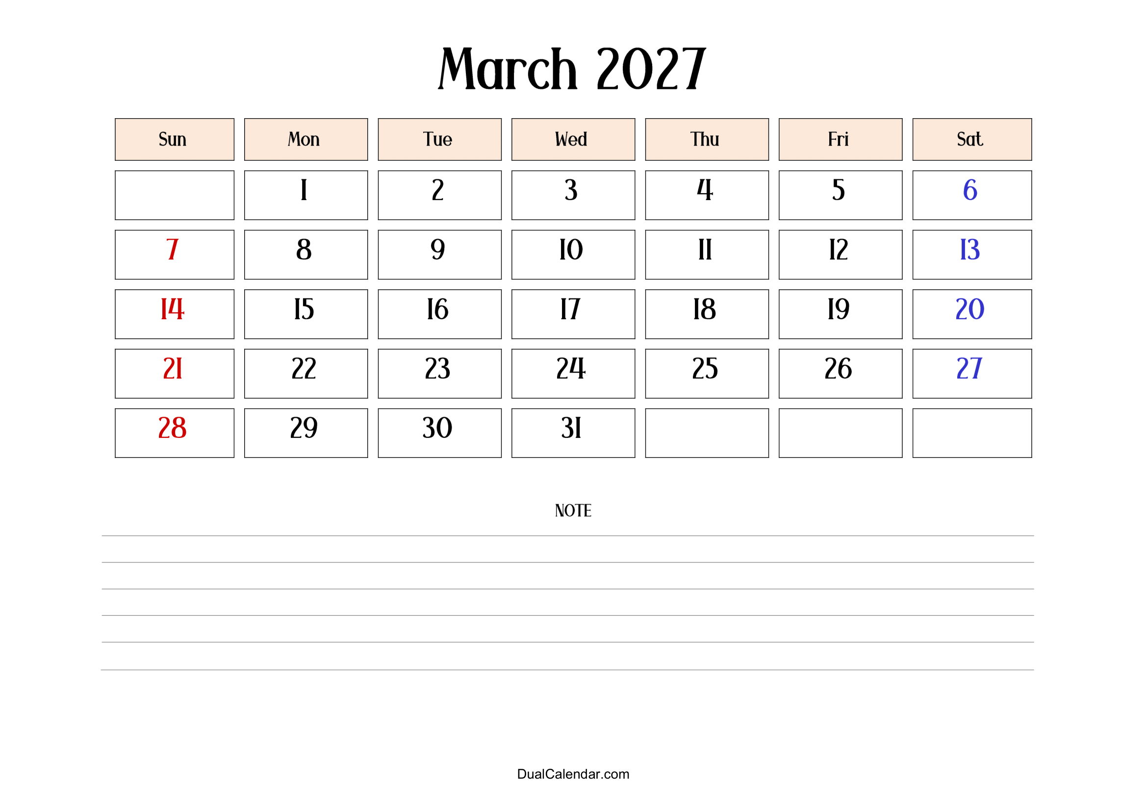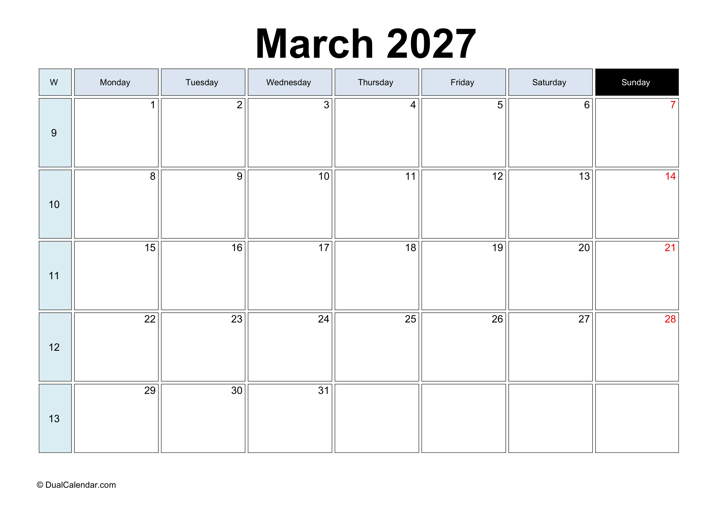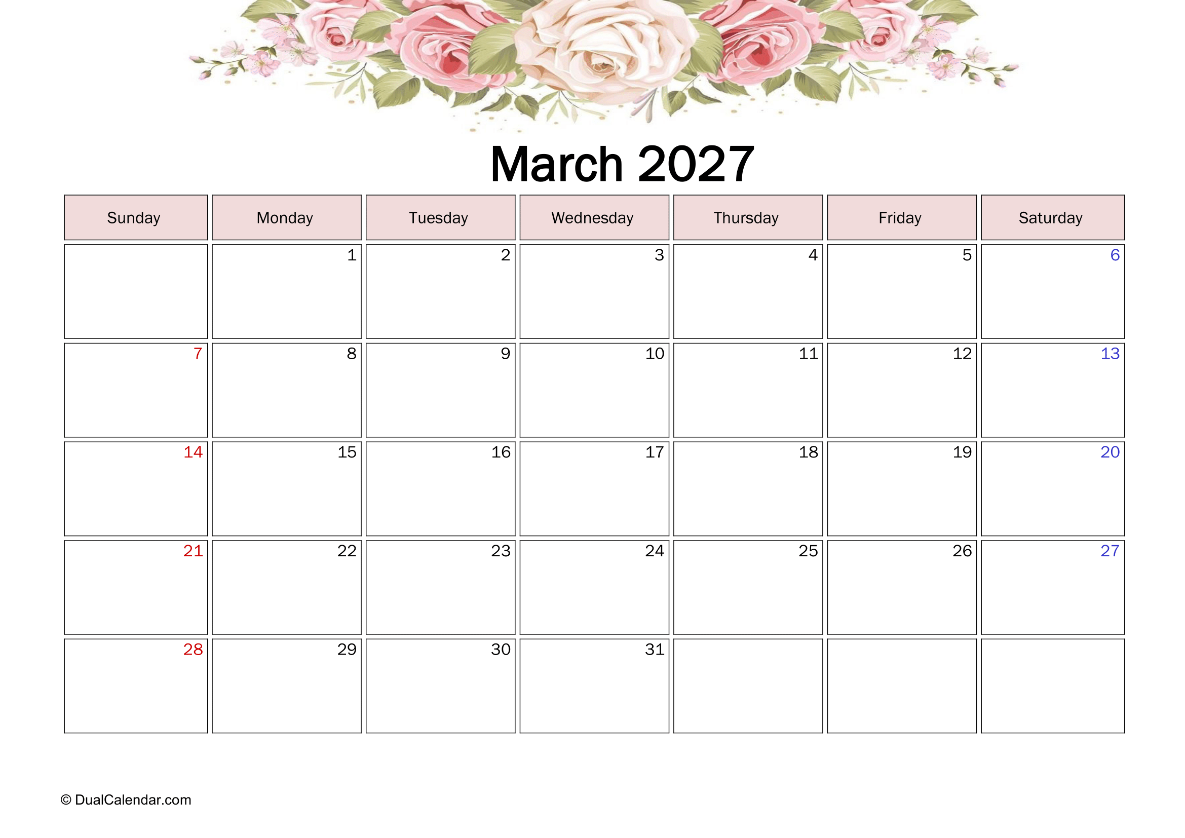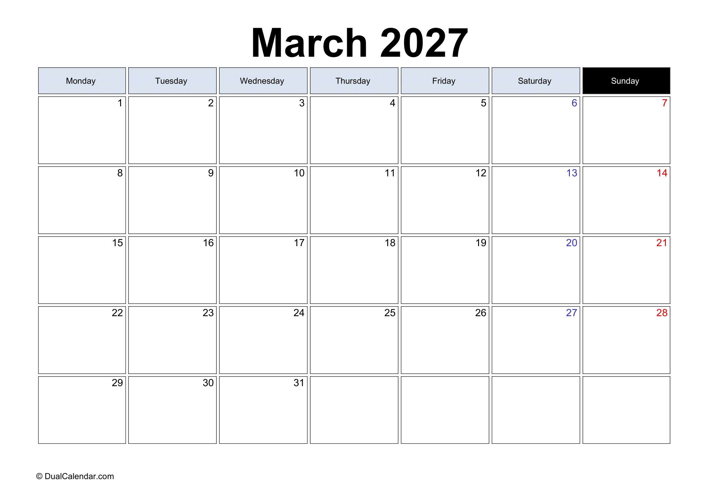 March 2027 Calendar – Free Printable Template