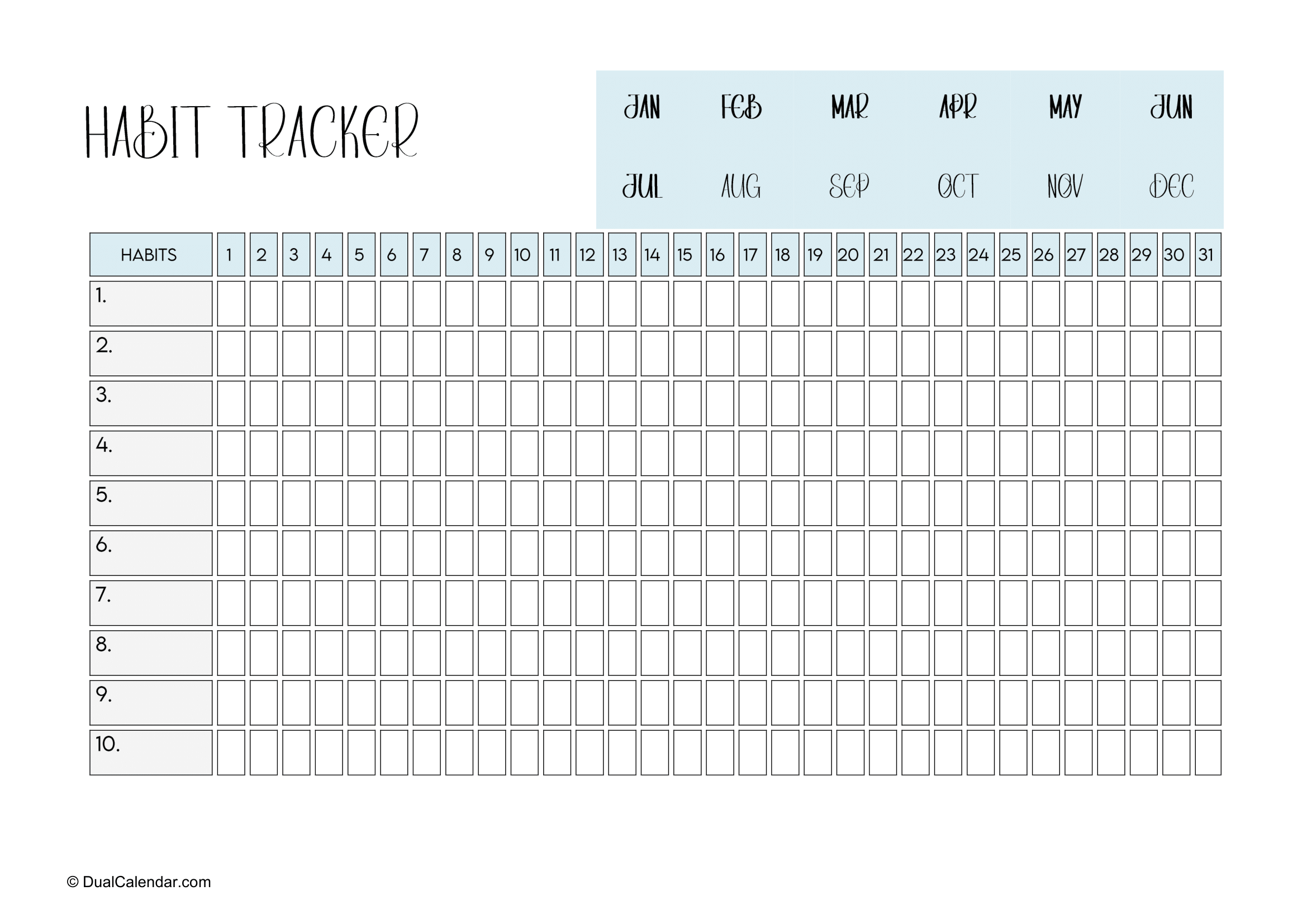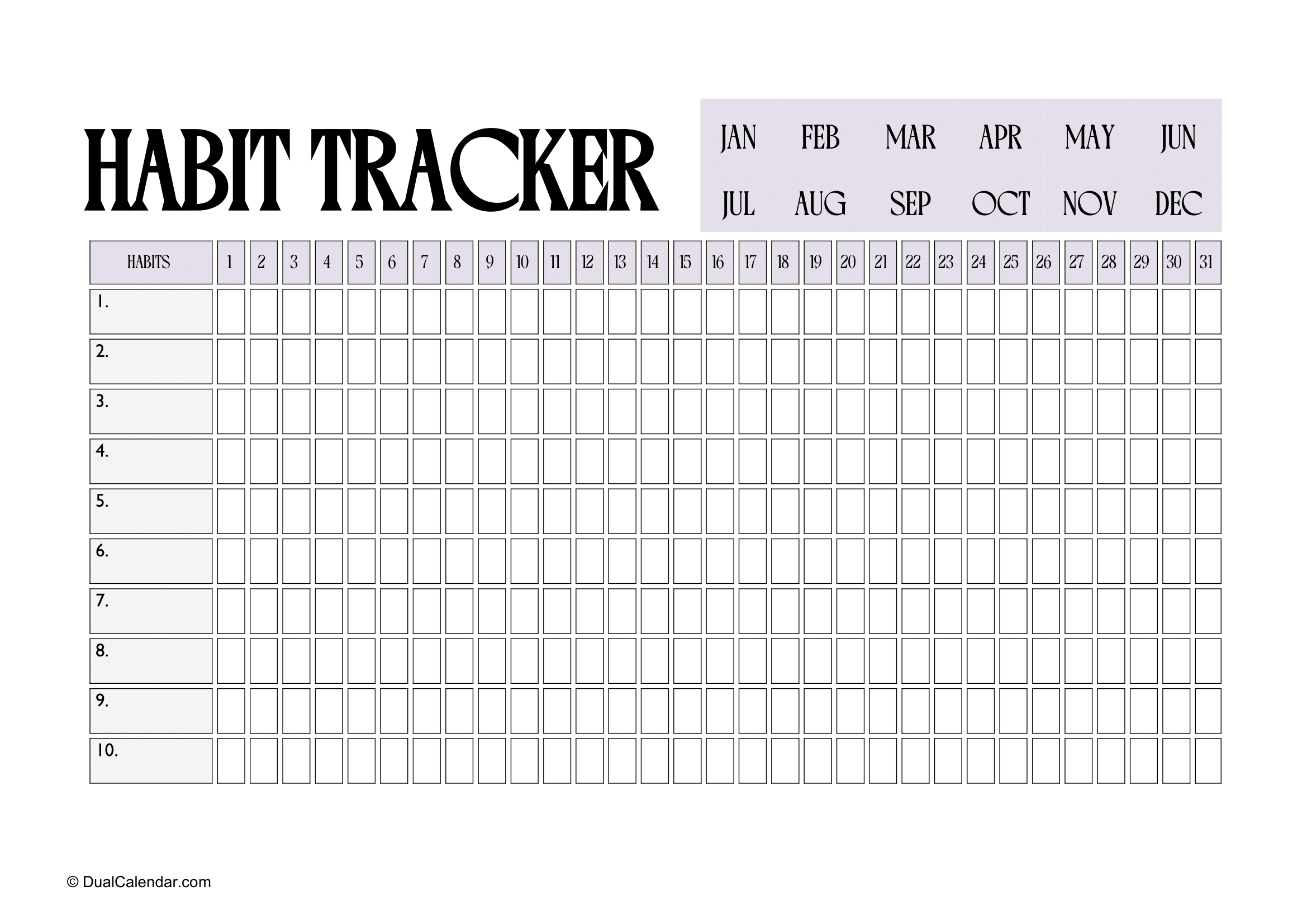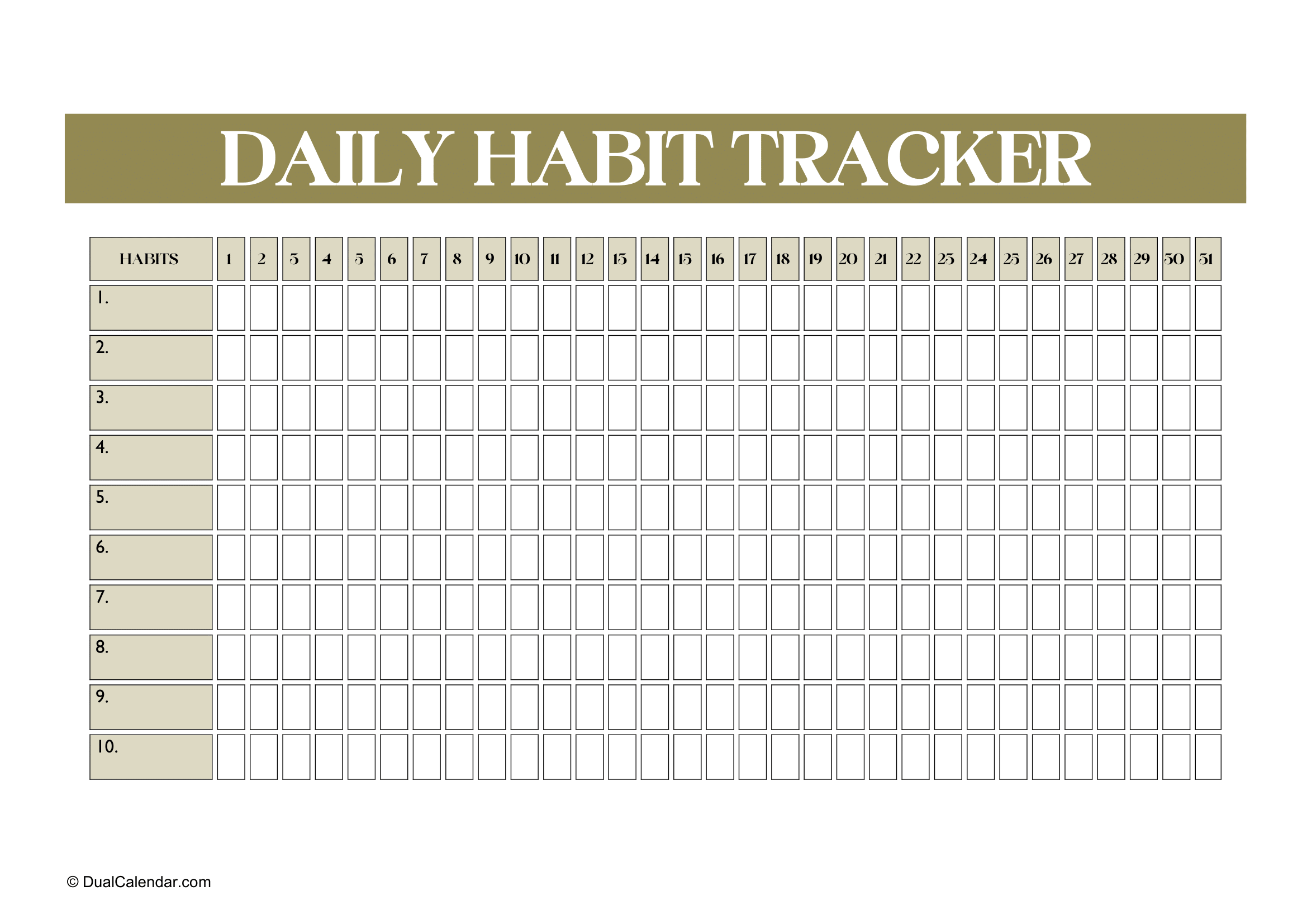 By using our daily habit tracker calendar, you begin to track your actions and routines, which creates a sense of responsibility toward your goals. There are 10 habits you can write our habit tracker calendar and total 31 column blocks, one block per day. Seeing your behavior on paper makes it easier to recognize patterns and understand where improvement is needed.