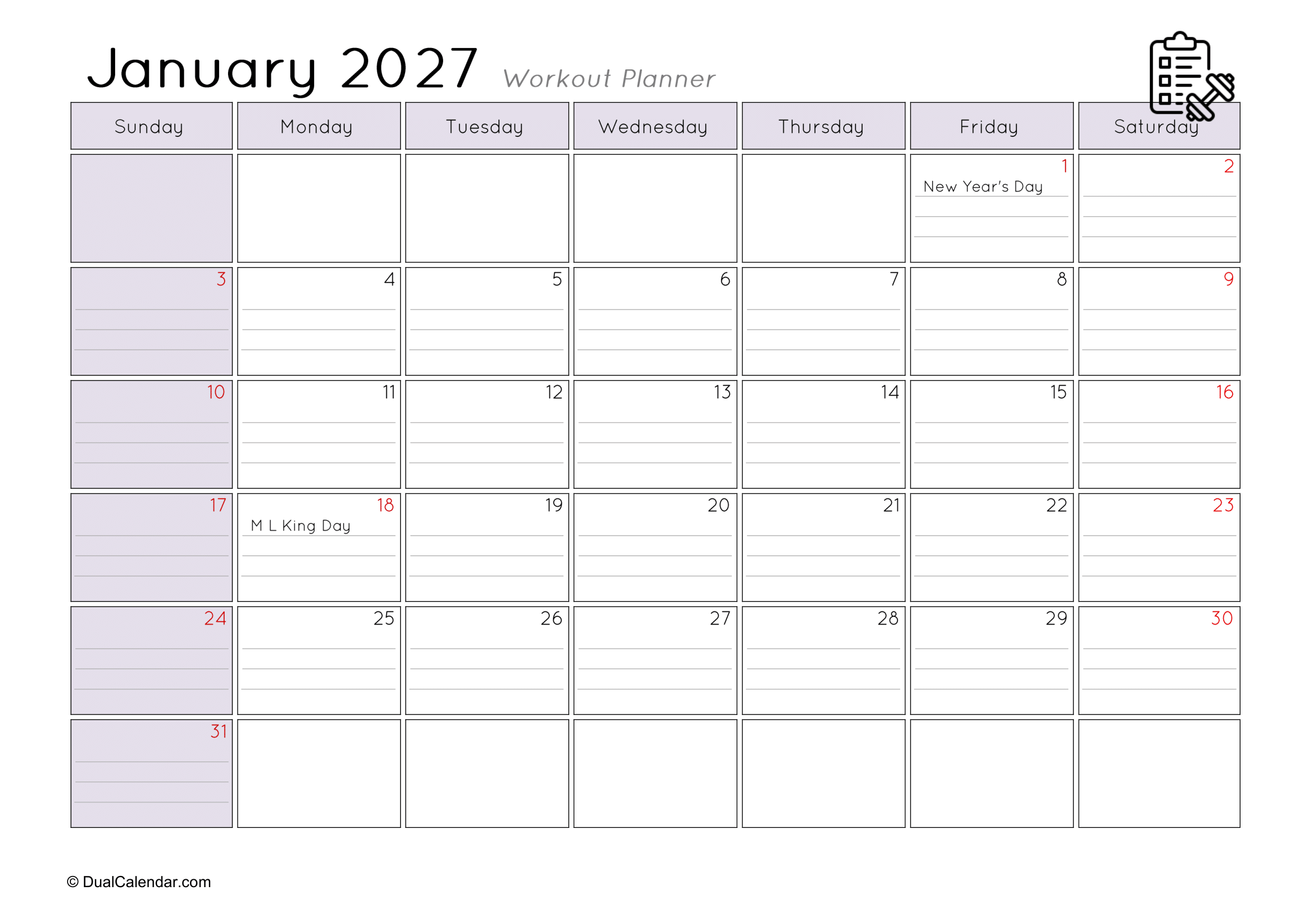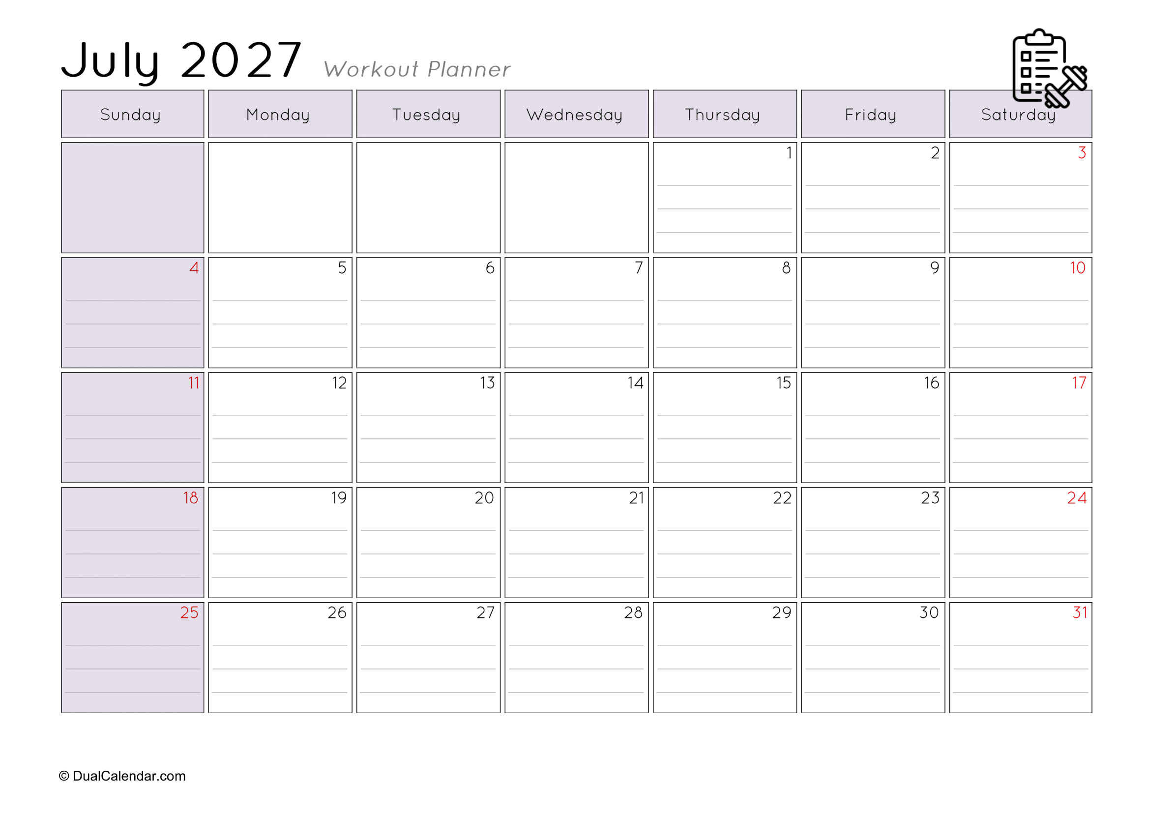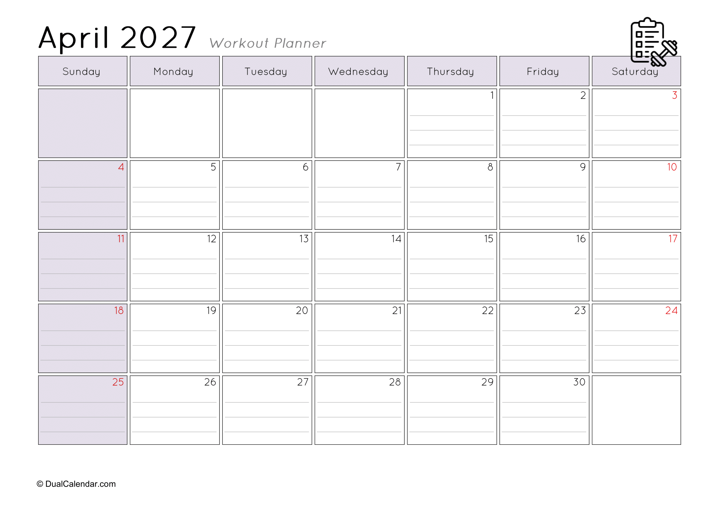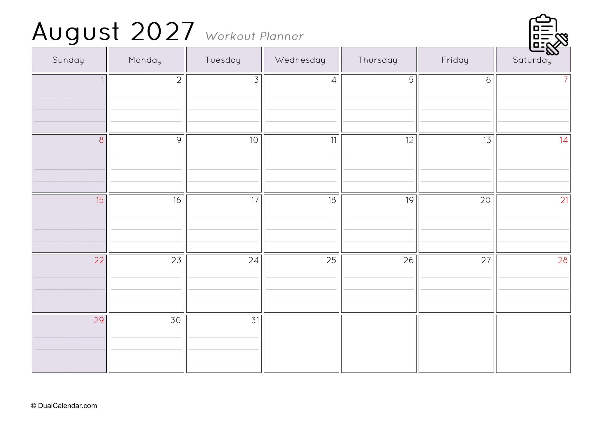 I found it very difficult to keep track of the workouts I did at the gym each day, such as remembering that today is Monday and I worked on chest exercises.The main challenge was where to note everything down. I even searched on Google for a monthly workout planner, but couldn’t find anything suitable template. After that, I decided to create my own templates so others wouldn’t face the same problem. Here, I have designed monthly workout planners for the year 2027, making it easy to track gym schedules, yoga sessions, jogging, or any other fitness activities.