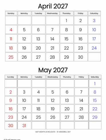 It is perfect for planning the start of summer in the US. Use May and June 2027 Calendar to organize Memorial Day weekend trips, early summer vacations, school breaks, and family gatherings. These 8 templates of two-month calendar helps track outdoor activity, festivals, and travel plans while balancing work schedules. In one of the calendar …