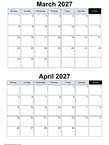 We offers a clear snapshot of two productive months March and April in one place. It’s perfect for planning spring activities, monitoring projects deadlines, and organizing daily tasks of 2 months, helping you stay focused, prepared, and well-scheduled throughout the season. 2 Month March April 2027 Calendar for Office or Corporate • Professional Vertical/Portrait layout …